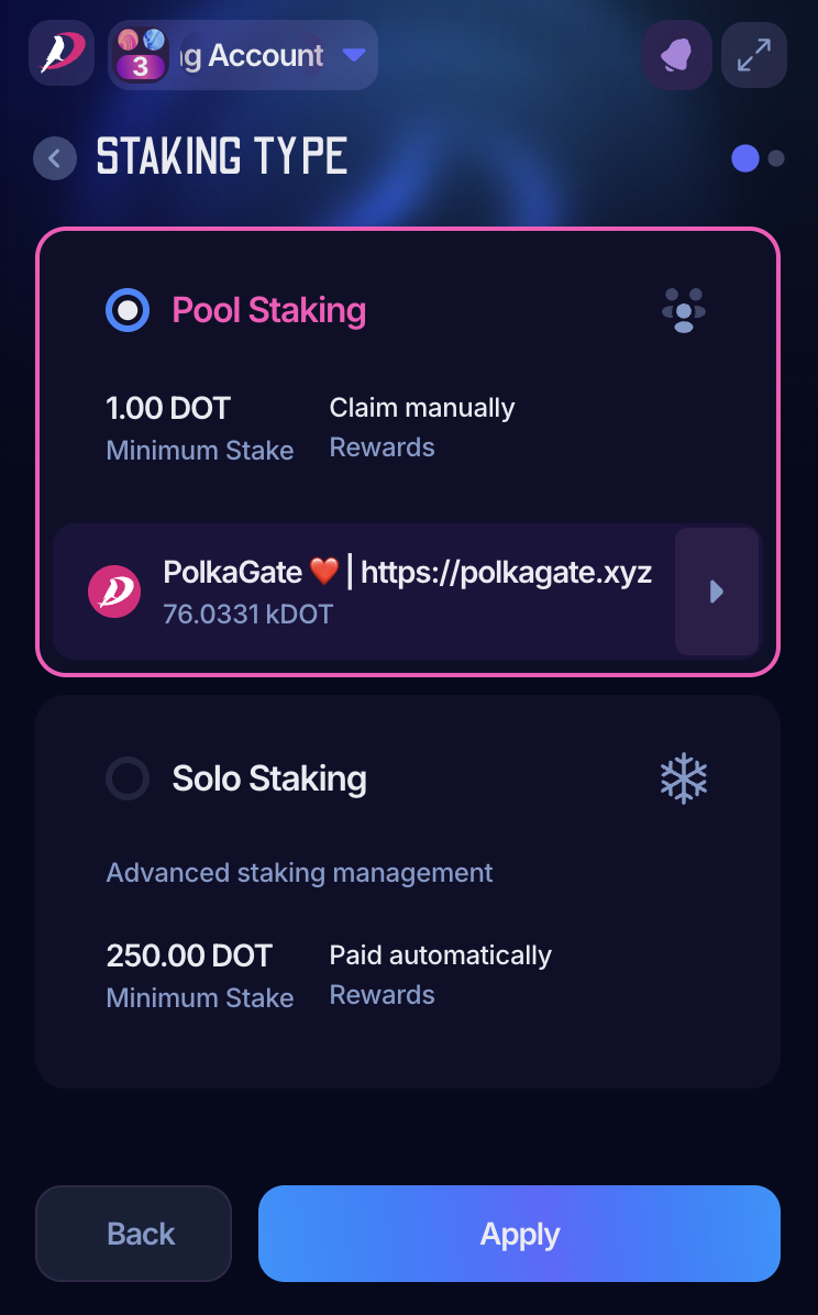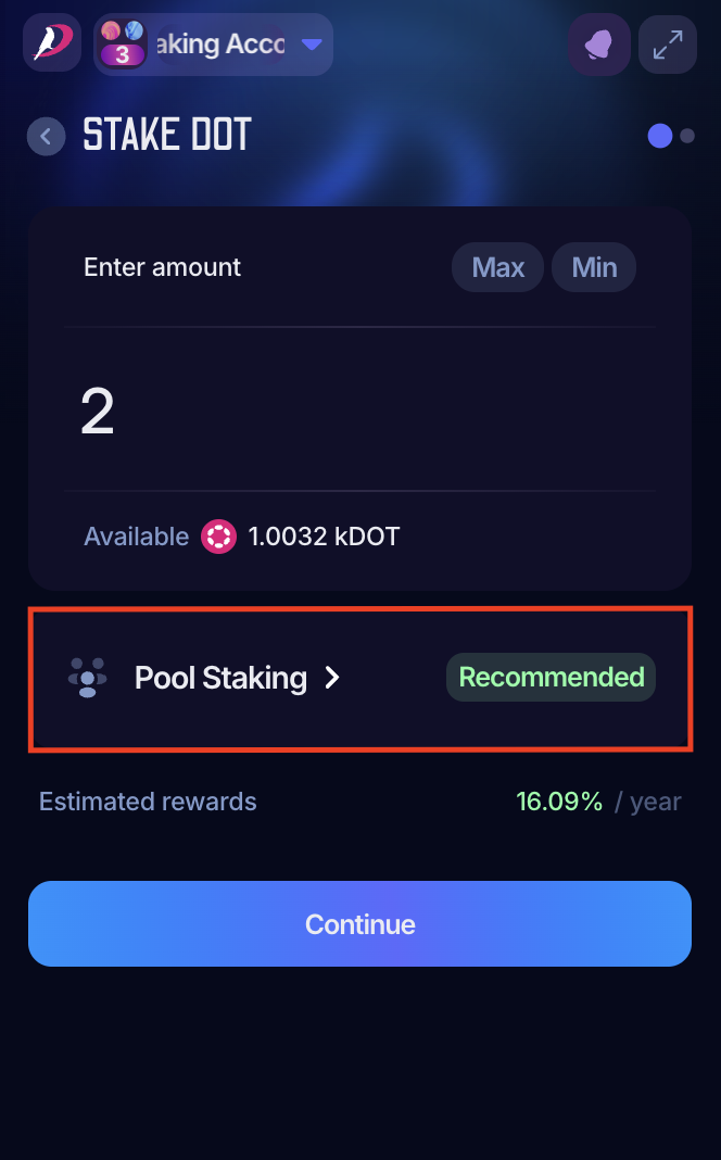 4. Enter the amount you want to stake. PolkaGate offers its pool as predefined. If you want to change it, click on "Pool Staking":