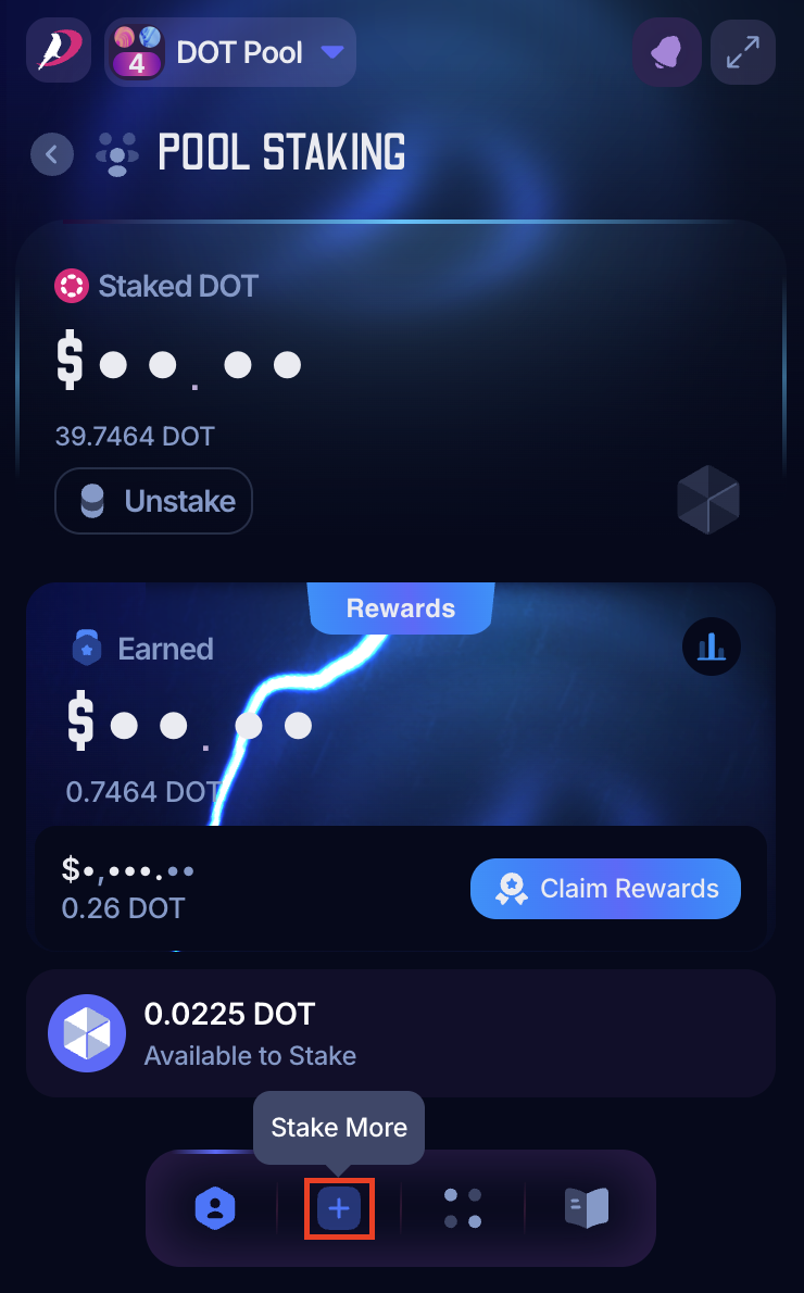 4. Click on the "Stake More" icon at the bottom of the extension: