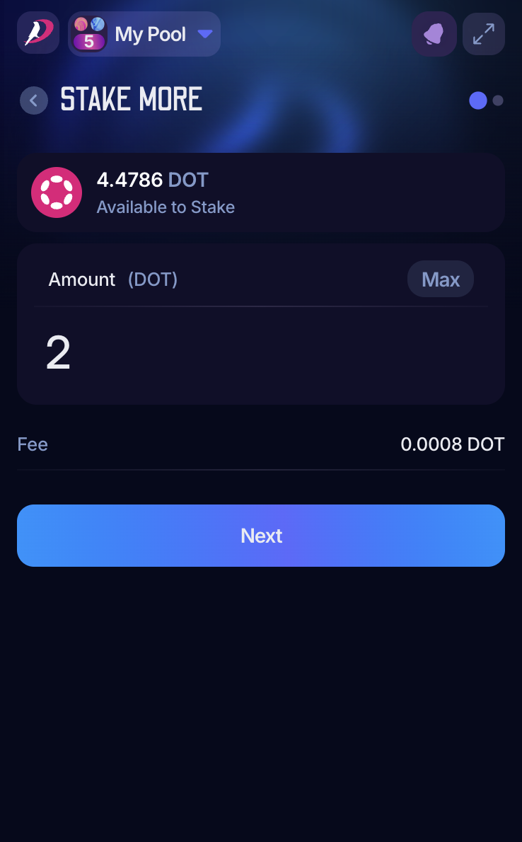 After joining a nomination pool, you can increase your stake by bonding more funds. These funds can come from your transferable balance or from the rewards earned as a pool member (compounding). The following steps will guide you through the process in either case.