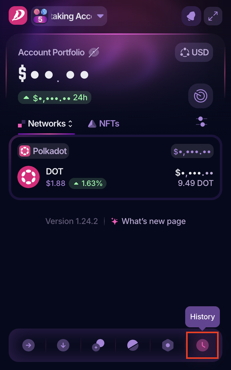 To view your transaction history of an account in PolkaGate, follow these easy steps: