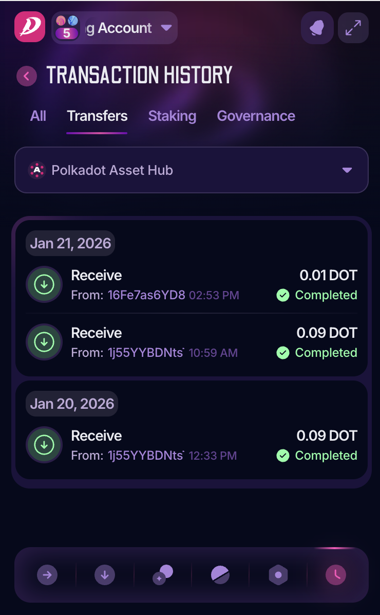This article shows how to view the transaction history of any of your PolkaGate accounts on any network within the Polkadot and Kusama ecosystem.