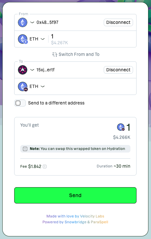 ‼️ IMPORTANT Hyperbridge allows you to send tokens to any account on any supported network. Always double-check that the address format is correct and that you fully control the destination account on the corresponding network. We recommend copying the address freshly each time and verifying it before proceeding with the transaction.